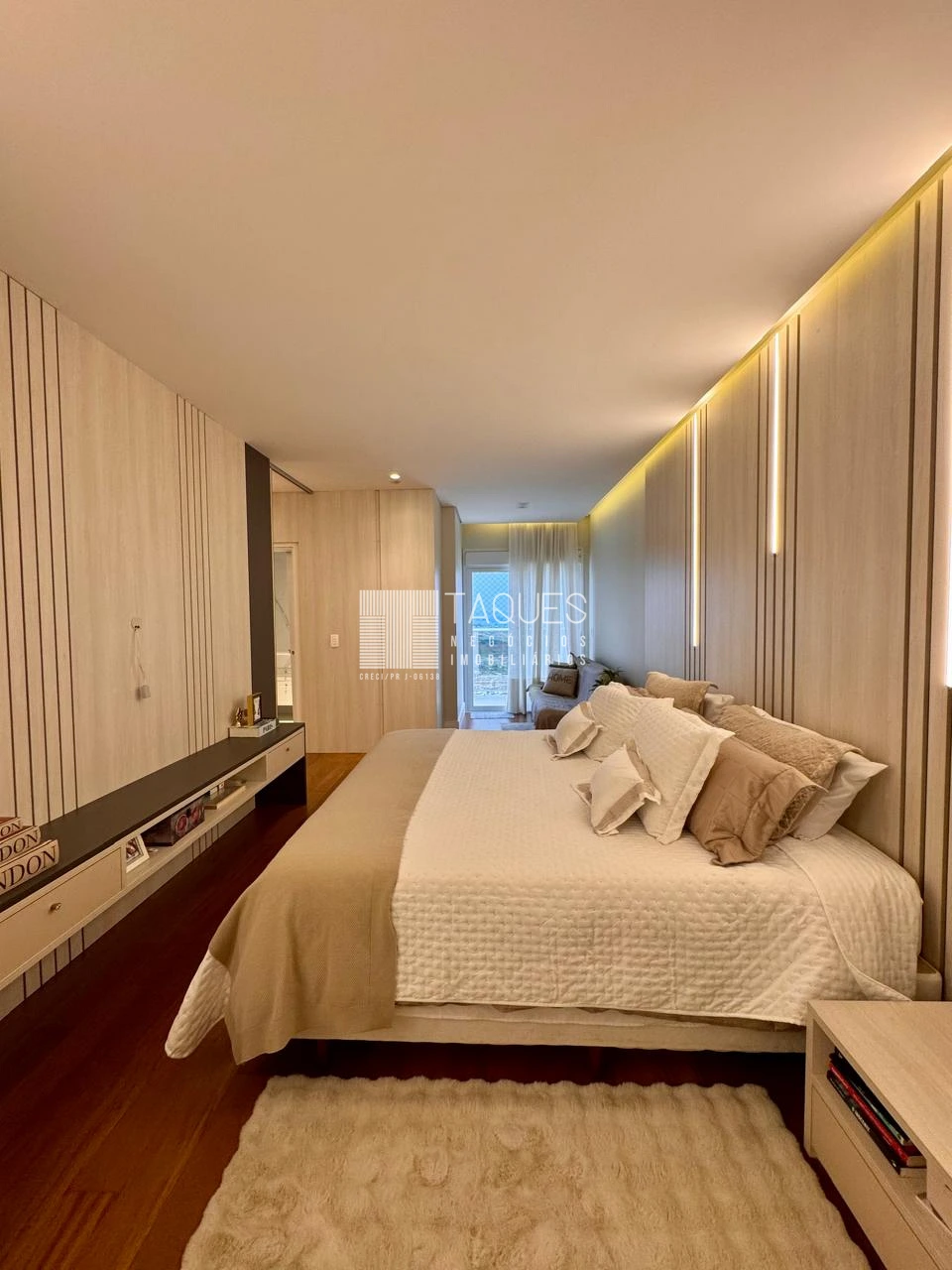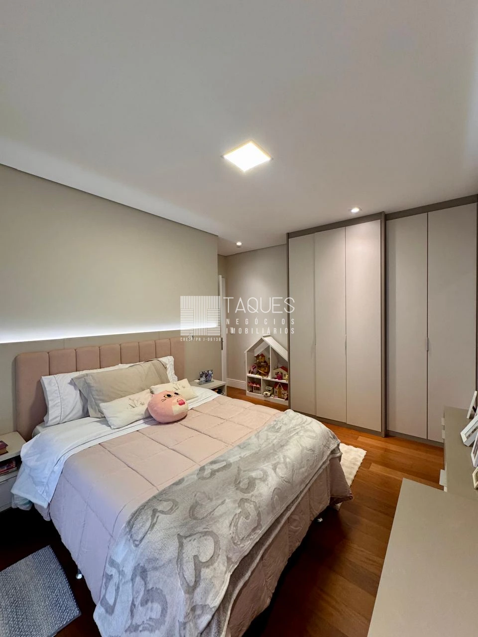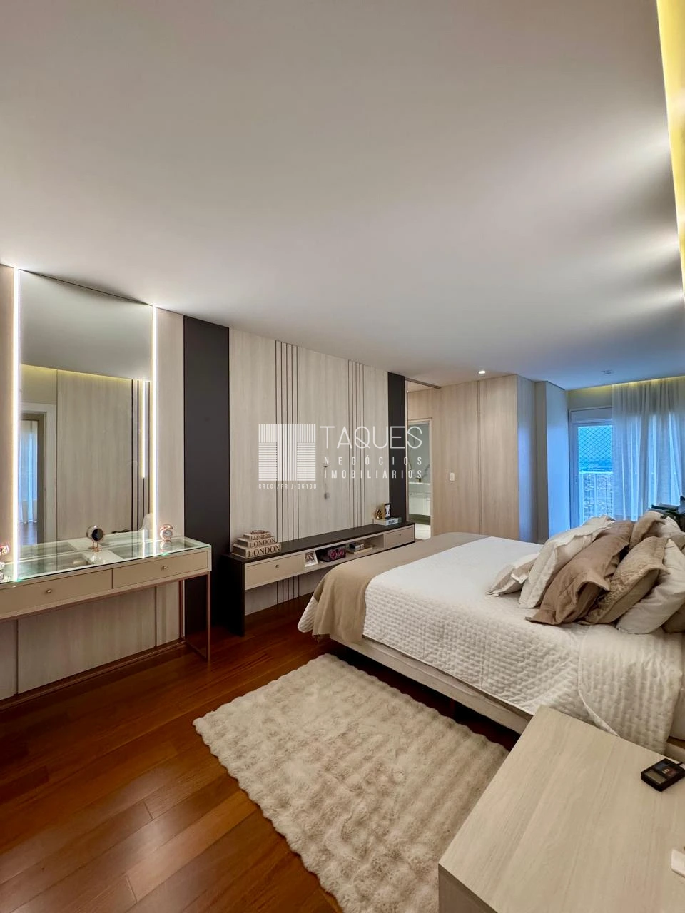 Na área intima do apartamento já percebe-se piso de madeira de lei,sendo disposta por 5 comodos: uma sala de cinema e 4 suites ( sendo uma master com closet).